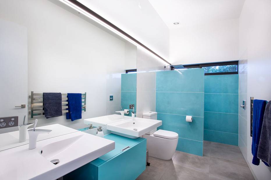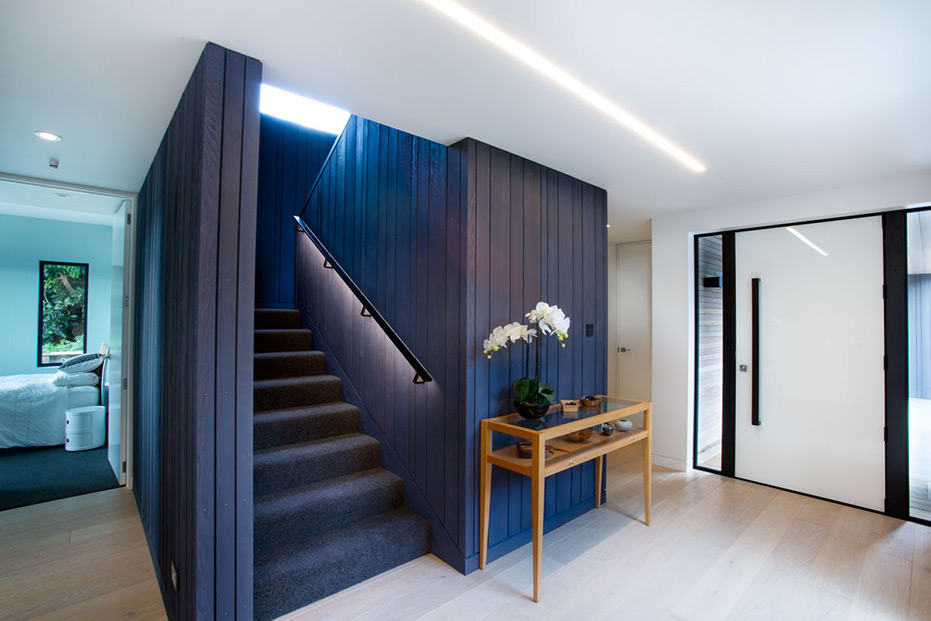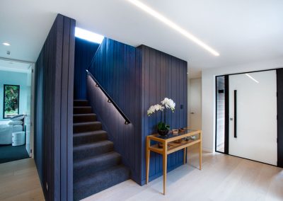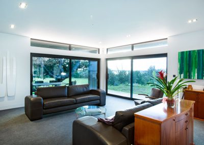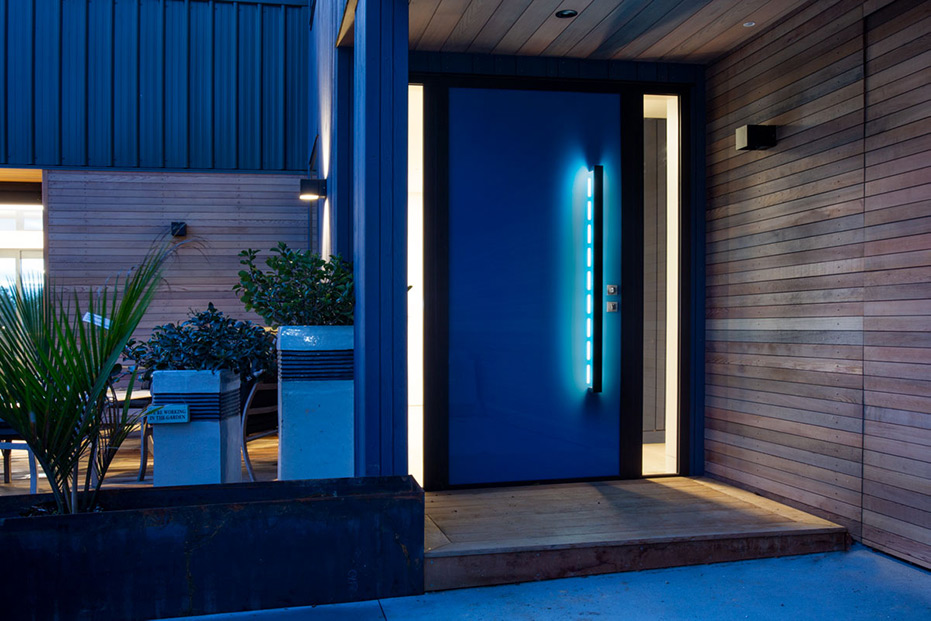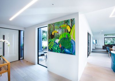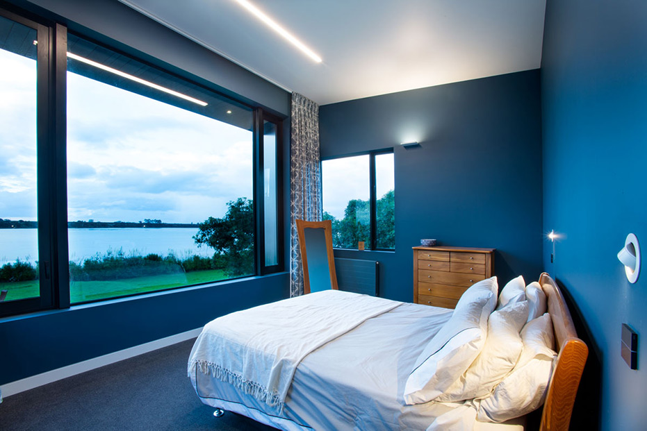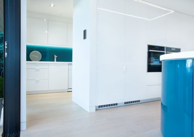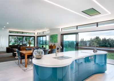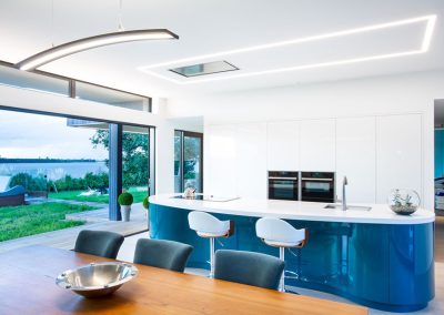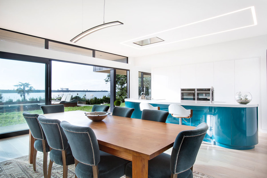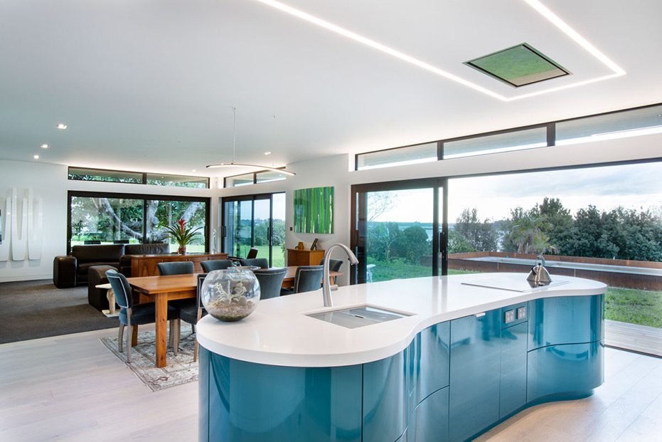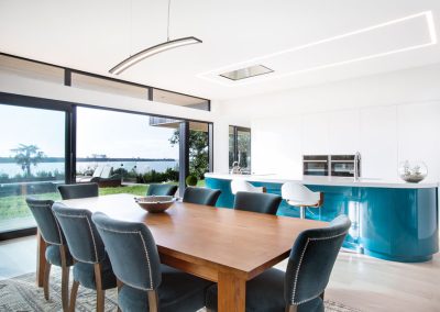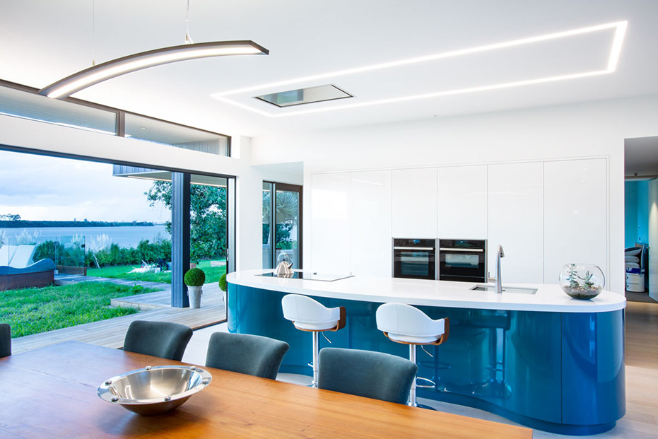 With a stunning harbour outlook and fresh, blue-toned interior colour palette highlighting the cool whites and indoor outdoor flow, this beautiful modern home demanded a careful lighting touch. David used custom-made kitchen task lighting in the ceiling, creating subtle warmth and welcome in the open-plan space.