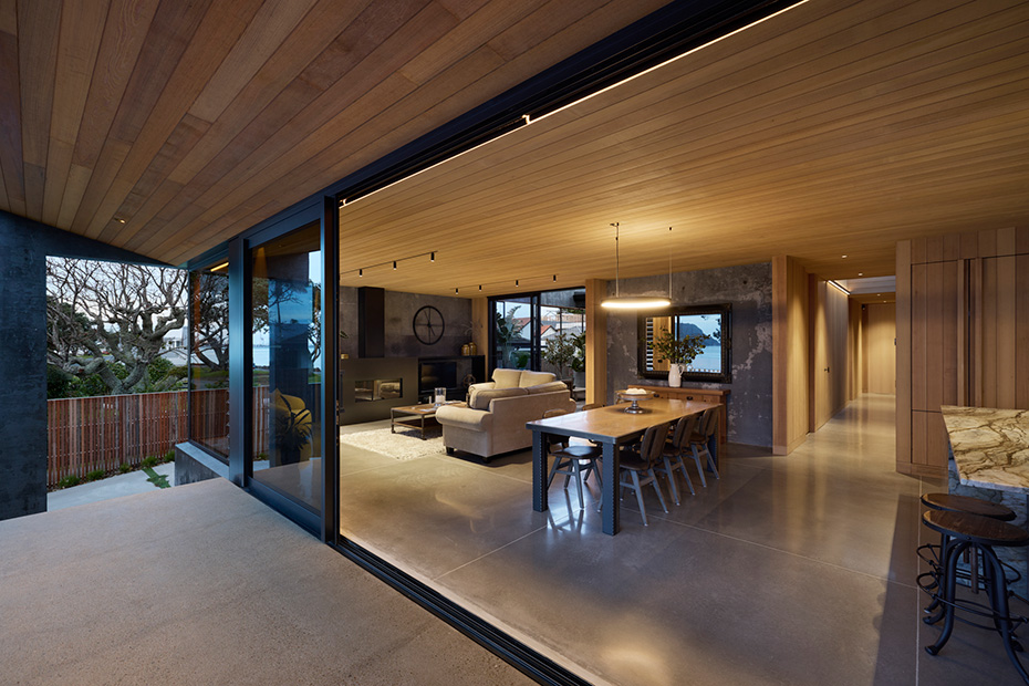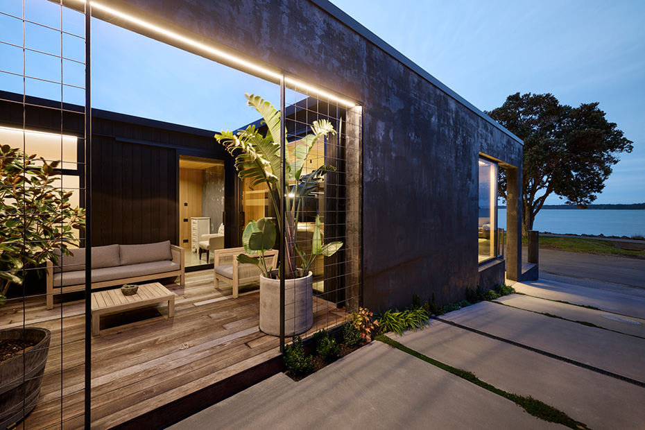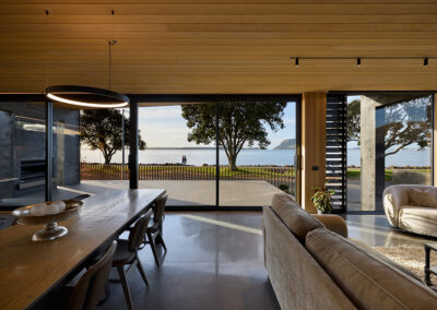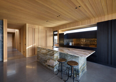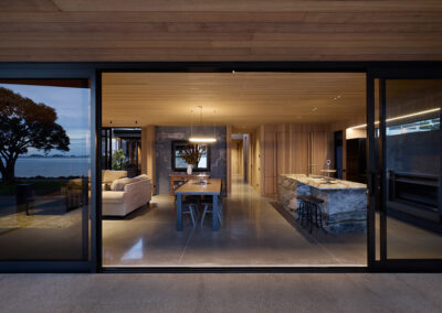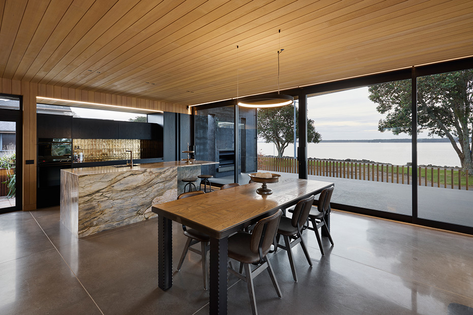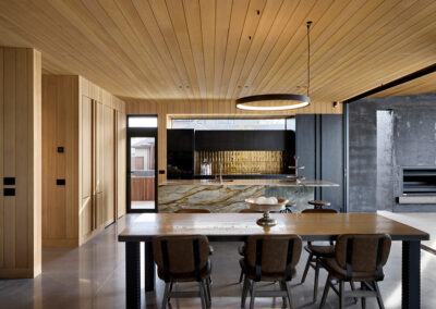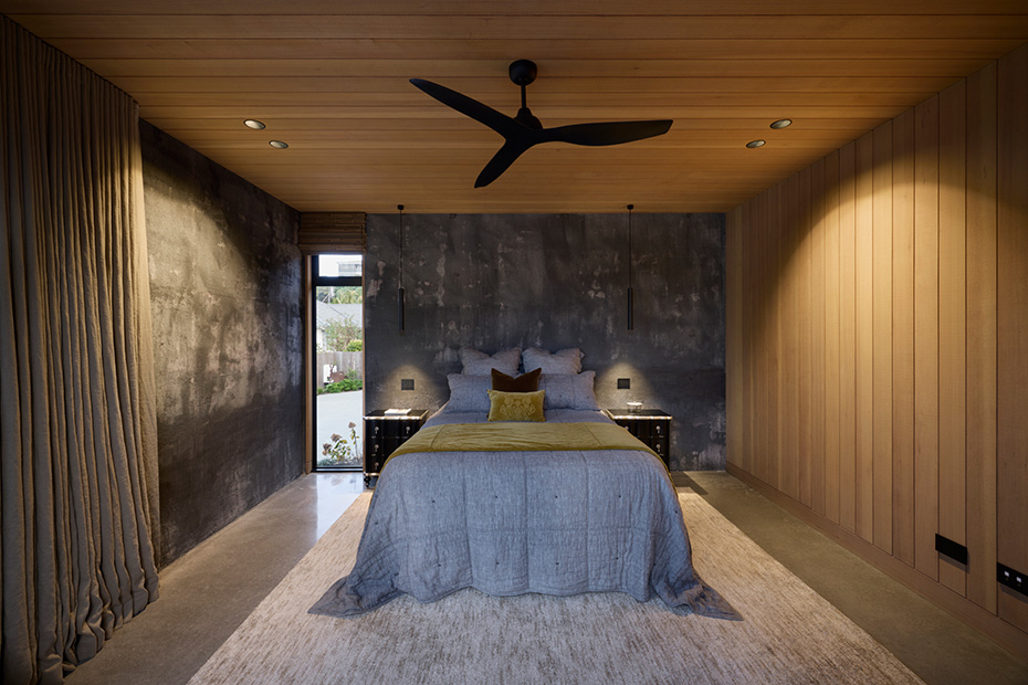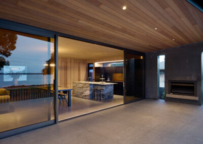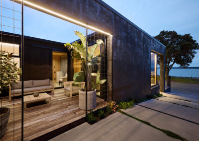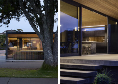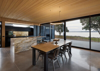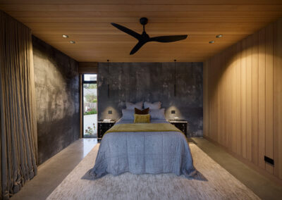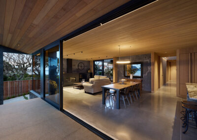 This beachfront home possesses a unique modernity, blending a sense of industrial strength with contemporary architectural simplicity. Its smooth, dark exterior is minimalist and imposing, emphasizing its functional essence, and creating a sense of safety and seclusion. Offset downlights and pendant reading lights create pockets of contrast in the master bedroom for ultimate visual comfort. Magnetic low voltage tracks are installed following the timber sarked ceiling, elegantly separating the living space from the dining area while providing flexibility in lighting placement. LED profiles were used throughout the home, tailored to the required lighting output. Bob Each Way 65 recessed profiles were used in the bathroom ceilings to match the wall-mounted extrusions in the skylights. Smaller extrusions, like the Flat Freddie 14, were used in areas requiring ambient lighting. This unique residence combines the robustness of industrial design with the clean lines of modern aesthetics, creating a harmonious balance between shelter and style.