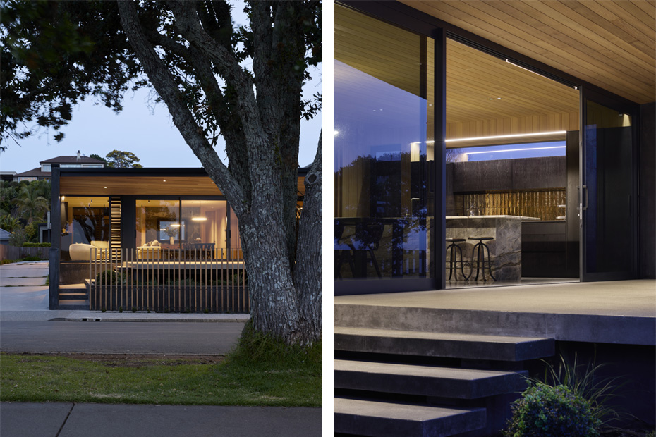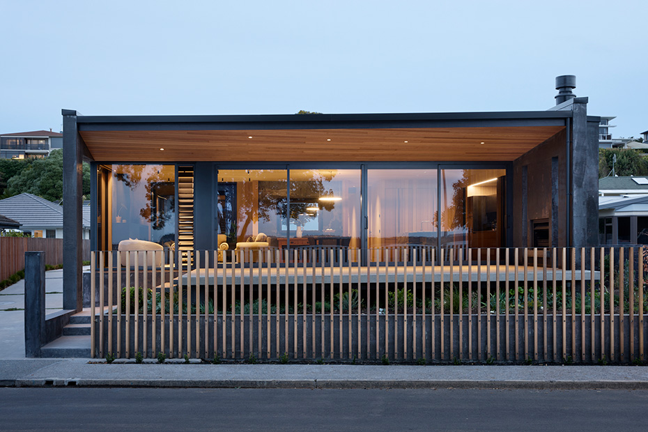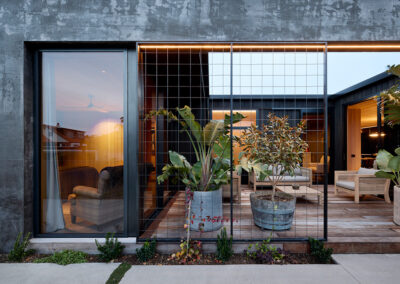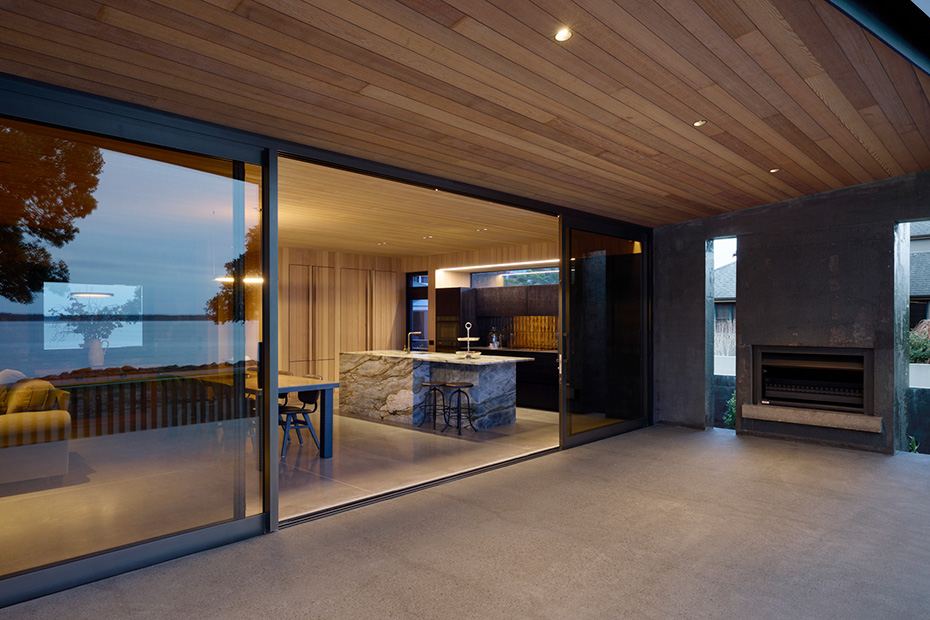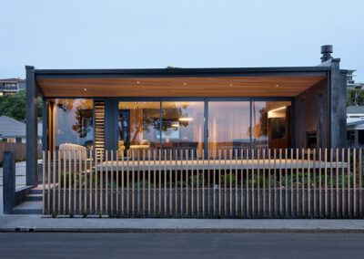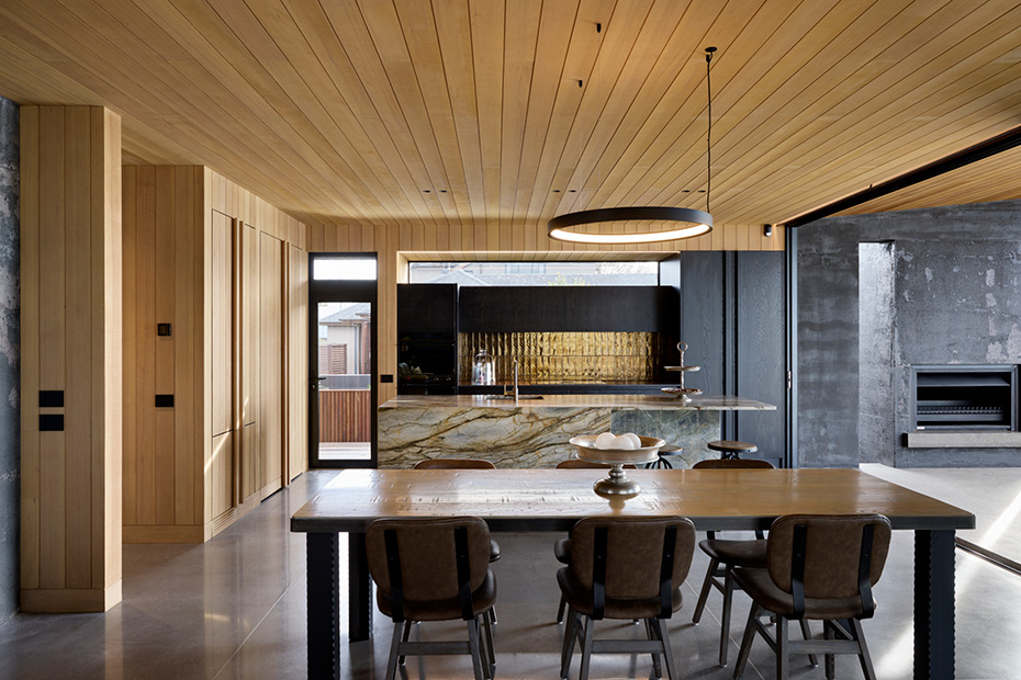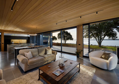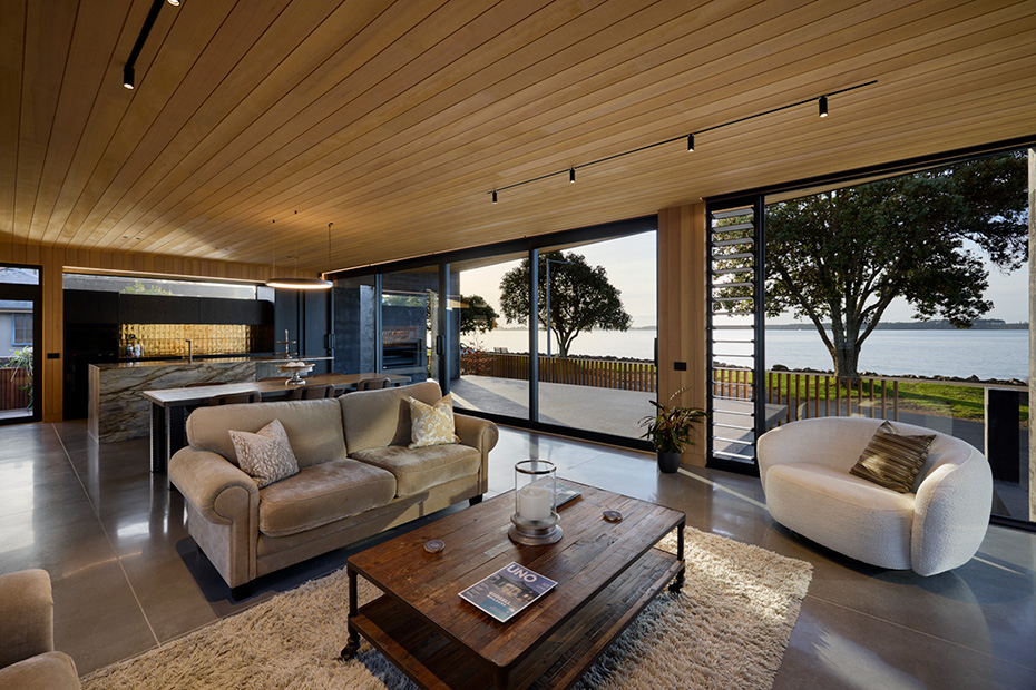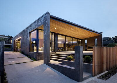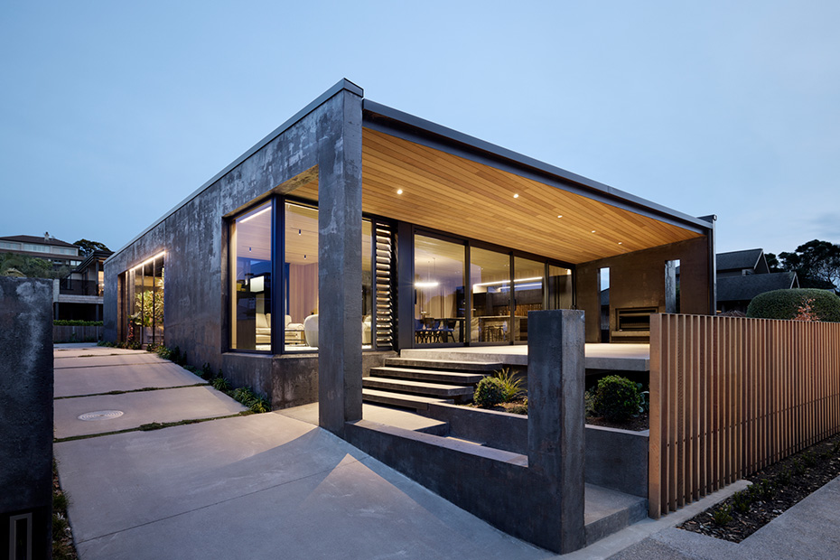 This beachfront home possesses a unique modernity, blending a sense of industrial strength with contemporary architectural simplicity. Its smooth, dark exterior is minimalist and imposing, emphasizing its functional essence, and creating a sense of safety and seclusion. Offset downlights and pendant reading lights create pockets of contrast in the master bedroom for ultimate visual comfort. Magnetic low voltage tracks are installed following the timber sarked ceiling, elegantly separating the living space from the dining area while providing flexibility in lighting placement. LED profiles were used throughout the home, tailored to the required lighting output. Bob Each Way 65 recessed profiles were used in the bathroom ceilings to match the wall-mounted extrusions in the skylights. Smaller extrusions, like the Flat Freddie 14, were used in areas requiring ambient lighting. This unique residence combines the robustness of industrial design with the clean lines of modern aesthetics, creating a harmonious balance between shelter and style.