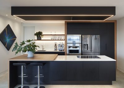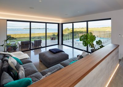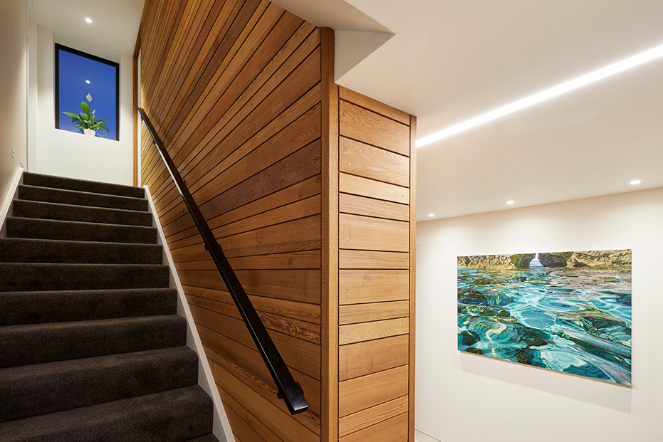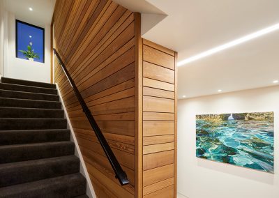 Imagine a house that stands like a sleek monolith, a modern marvel. As dusk falls, the structure transforms, its sharp edges, and clean lines outlined by a seamless array of integrated lights. The main objective of this project was to achieve exceptional quality art lighting throughout the house. A recessed profile was installed in the entryway to enhance the general lighting of the space, ensuring it complements the art and track spots without drawing attention away. The project was automated with Cbus Lighting Control, this system allows the lighting to be set to exact levels tailored to the clients’ needs for showcasing artworks and setting the ambiance in different rooms. One of the standout achievements in this project was the successful implementation of Gib Trimless Delta Spy fittings in the sarked ceiling, showcasing the builders’ precision and craftsmanship. These downlights were chosen due to their tilt capability and superior glare control. This is achieved through the deep inset LED chip and lens, ensuring optimal lighting without distraction.