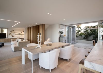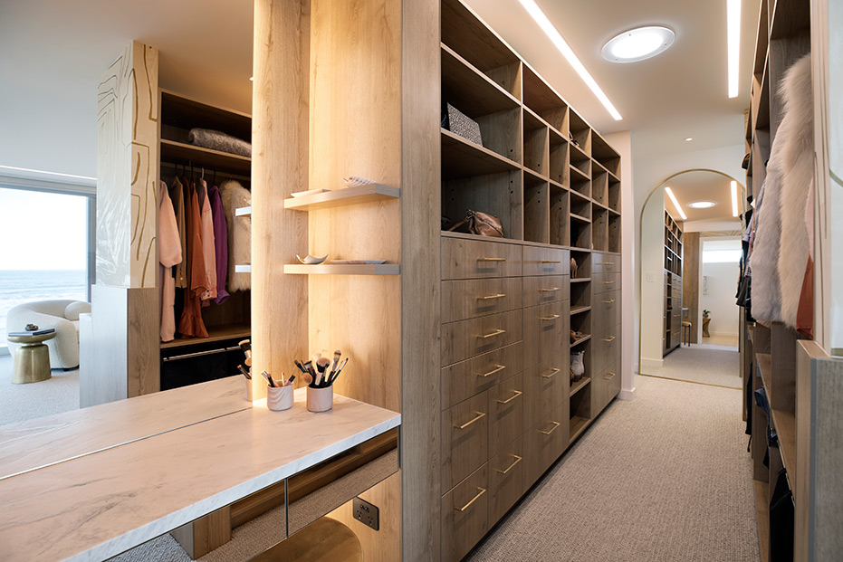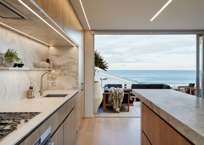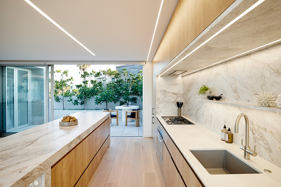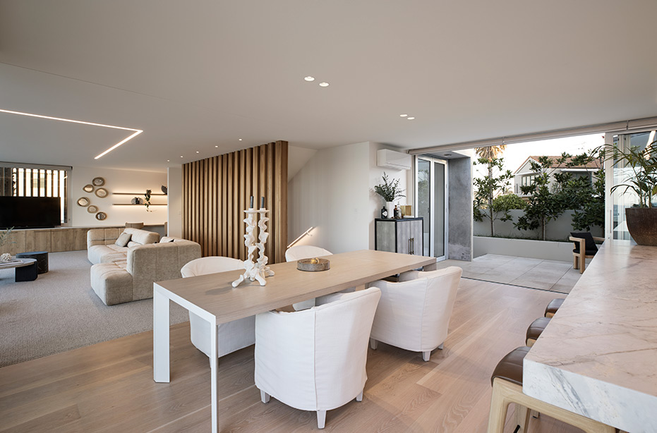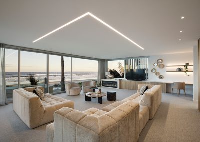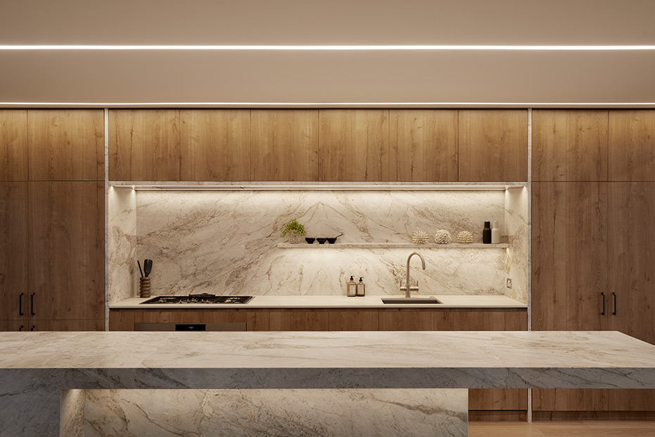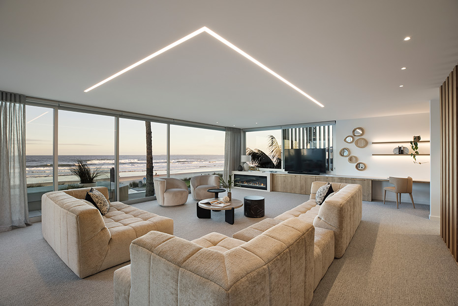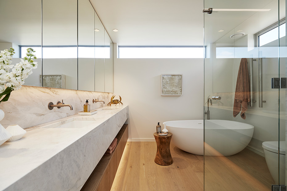 With clean lines and elegant design choices, this surfside Mount Maunganui four-bedroom, three-bathroom home captured the hearts of judges far and wide. The property has won a host of prestigious awards, including the 2020 Registered Master Builders House of the Year Gold Award, and the National Kitchen and Bathroom Association Supreme Kitchen and Kitchen Lighting Design Award. Our challenge was to seamlessly blend high-tech lighting solutions into this superb natural aesthetic. To do this, we integrated warm LED Strip lighting over the coolness of the Matarazzo marble, highlighted natural timber tones with high colour rendering fittings and lent a welcoming glow to the home.