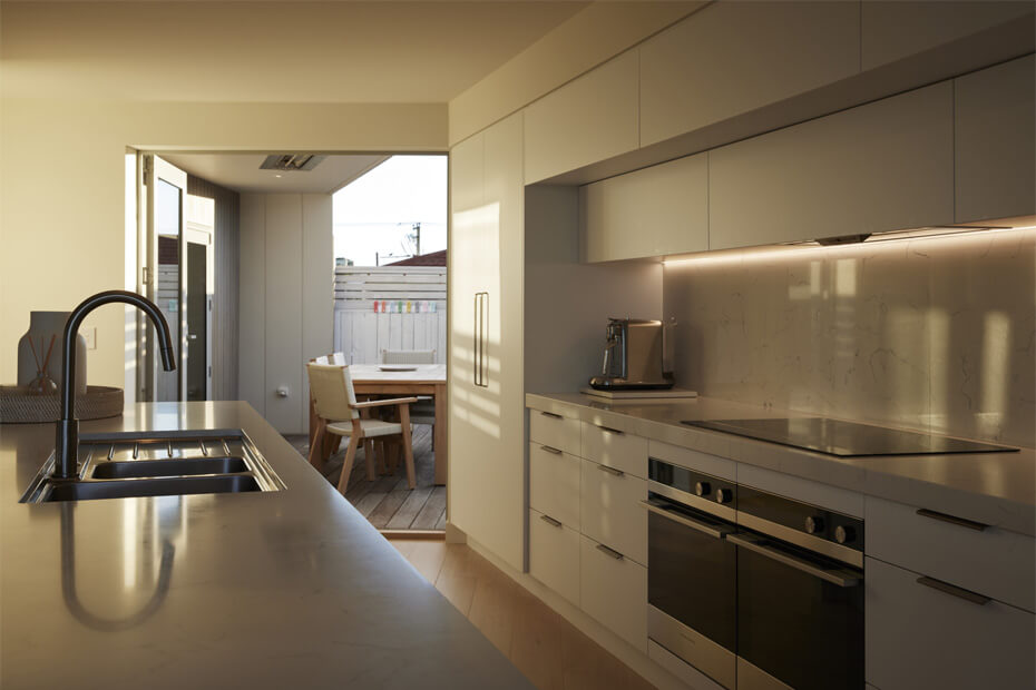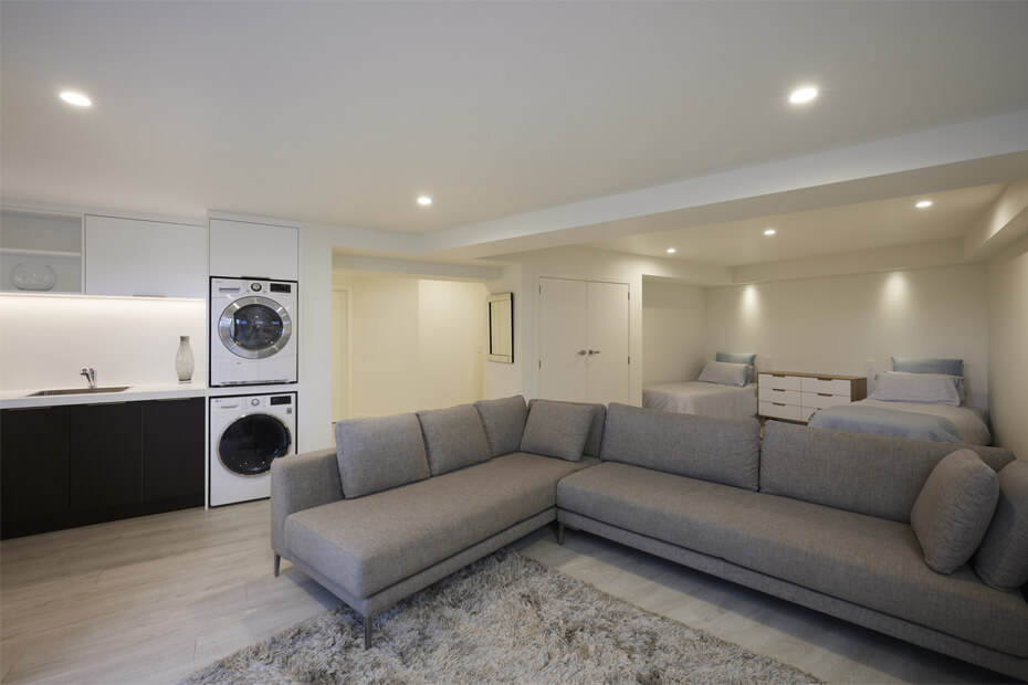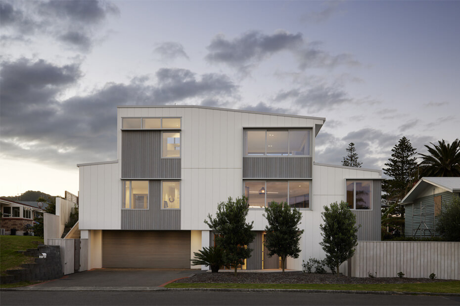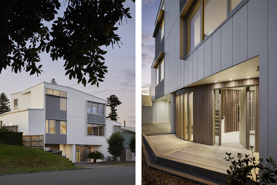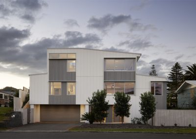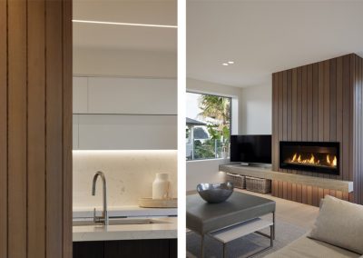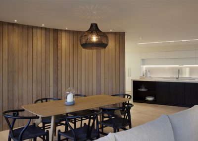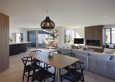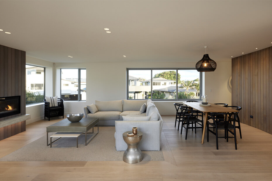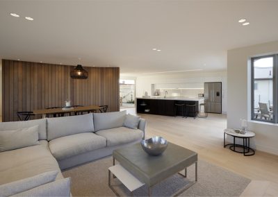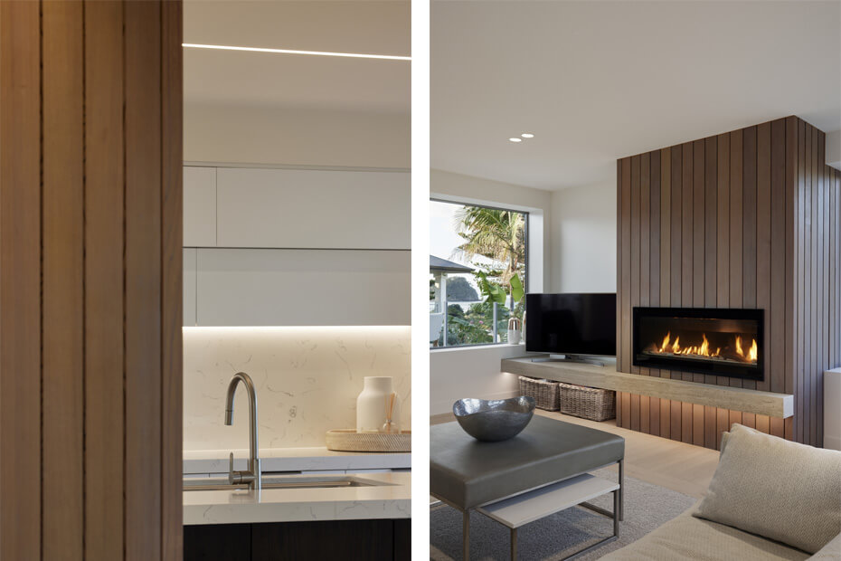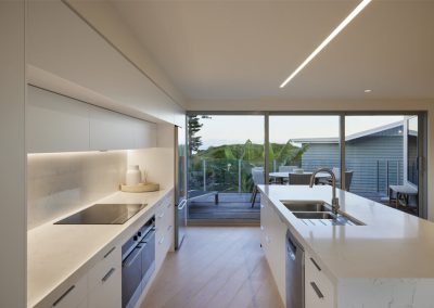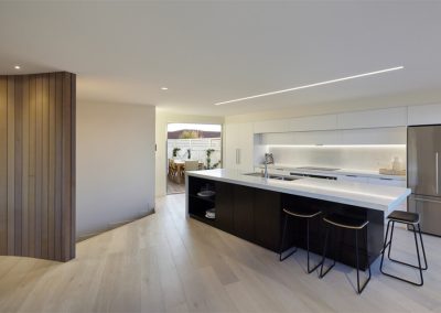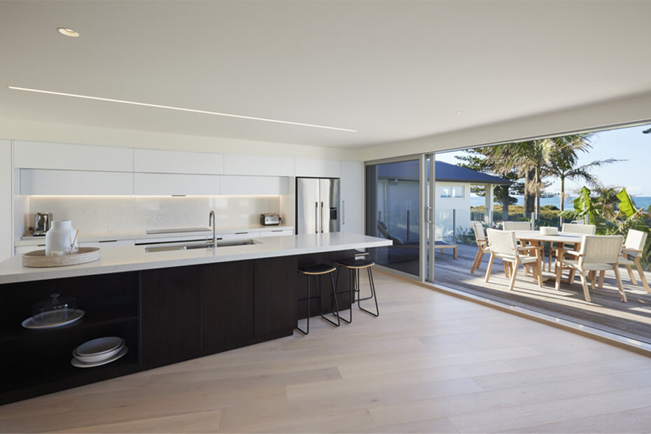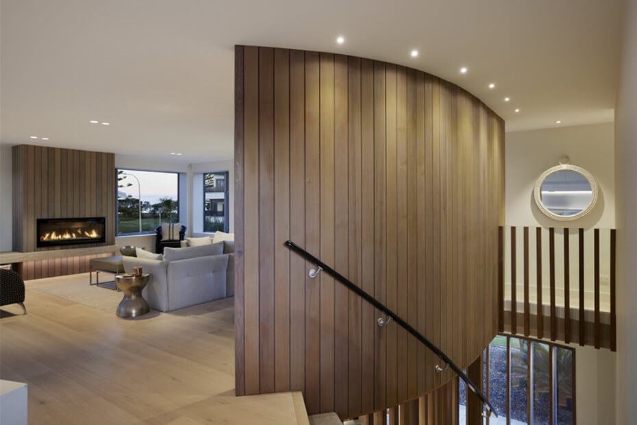As part of a substantial renovation to an existing three-storey residence, our work on this home involved close collaboration with the architect, Brendon Gordon. Our brief? A lighting design that would deliver maximum ‘wow’ and complement the natural textures and ocean views found throughout the home. The standout feature of this property is the curving wooden wall and exposed balusters that hug the top and bottom of the main staircase, respectively. These were highlighted through the use of unobtrusive, recessed downlights that follow the curve of the wall and draw the eye to the rich grain and natural variation in the timber. Given the low ceiling height on the first two floors of the home, recessed downlights were used throughout the kitchen, living, and dining areas to create open sightlines to the outdoor spaces. At dusk, the warm tones of the lighting mirror the golden Bay of Plenty sunsets, creating a series of intimate, interconnected spaces when darkness falls.